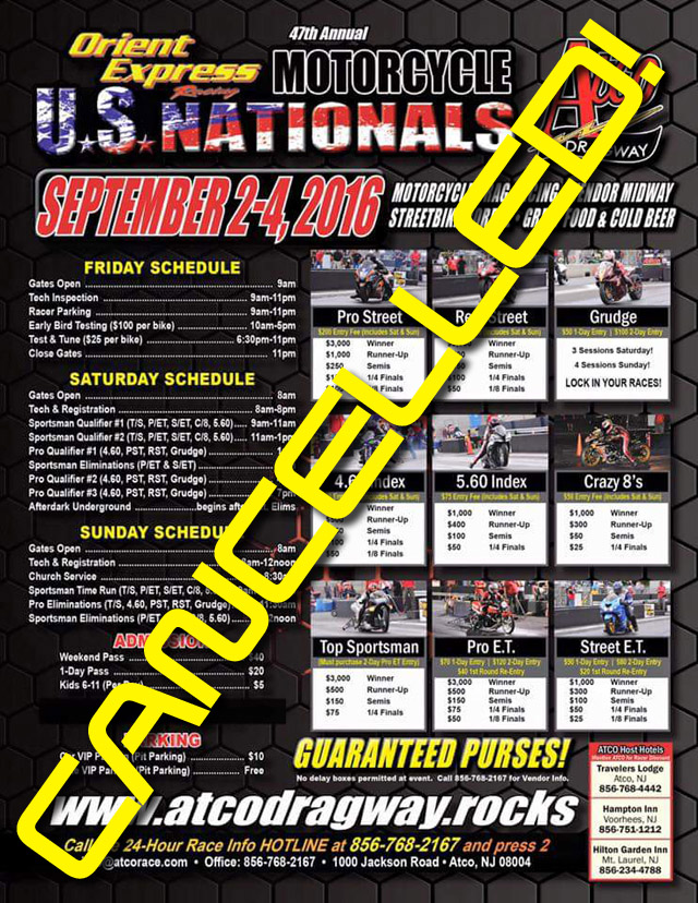 Atco Raceway released the following statement on the U.S. Motorcycle Nationals scheduled for Sept. 2-4, – “Due to the recent shift in weather we have decided to make an early call in order to give all of our bike racers time to make alternate plans. We are currently looking at a 60-70% chance of rain both Saturday and Sunday with even more concerning sustained winds at 25-30 mph. While we were very excited to host the Orient Express Motorcycle US Nationals and are looking forward to September 2017, we feel it is in the best interest of the racers, vendors and spectators to make the call now. We will still hold the “early bird” testing session for tomorrow. Gates will open at 9am and racing will begin around 10am. All bikes and cars are welcome to attend. We apologize for all inconveniences this causes and look forwarded to seeing you all next year. Thank you for your cooperation and support.”