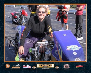Carrie Seifert Tate a.k.a. “The AMAZON” is currently Number 2 in national points with the AHDRA Pro Drag Nitro Harley Class. She has had two back-to-back runner up finishes. The first at the Northeast Nitro Nationals in Atco, New Jersey, May 19th and 20th . Then again at the Ohio Bike Week Nitro Nationals in Norwalk, Ohio, June 9th and 10th . Both times she lined up with Steve Pier in the finals, the current Number 1 points leader.