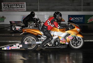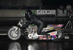 The Mickey Thompson MIRock Superbike Series blistered legendary Rockingham Dragway this past weekend, as the world’s largest motorcycle drag racing organization concluded it’s 2013 season with the Lee’s Performance World Finals on November 1-3. Mother Nature made it a tricky three days for Steve Earwood’s hardworking staff, washing away a beautifully prepped track with a deluge on Friday and coming back with rain, cool, and damp conditions Saturday night. But through it all, Rockingham starter “Little Man” and his staff kept spraying plenty of PJ1 traction compound to deliver track records from the most razor-edge bikes around—the high horsepower, street legal rubber-shod machines of Orient Express Pro Street.