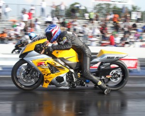 No combination rose to that challenge better than multi-time AMA Prostar national champ and NHRA national event winner Ellis, his fellow Vance & Hines employee Ritter, and their Suzuki GSX-R1000. Ellis qualified number 1 and made his way to a semifinal made up entirely of riders who’d ridden for Teasley’s team boss Coby Adams at some point in their careers—Ellis himself, Ryan Schnitz, superstar Rickey Gadson, and current pilot Teasley. Ellis advanced in style, nailing a record 7.83 to beat Schnitz. Teasley beat Gadson, then took the tree against Ellis in the final. But setting the record was no fluke for Ellis, and Ritter had the bike firmly in the 7.80’s at this point. Teasley, running a whole new nitrous system installed by owner/tuner Roger Starrette, was stuck in the .90’s and event promoter Jason Miller handed the cash bounty over to Ellis in the MIR winners circle.