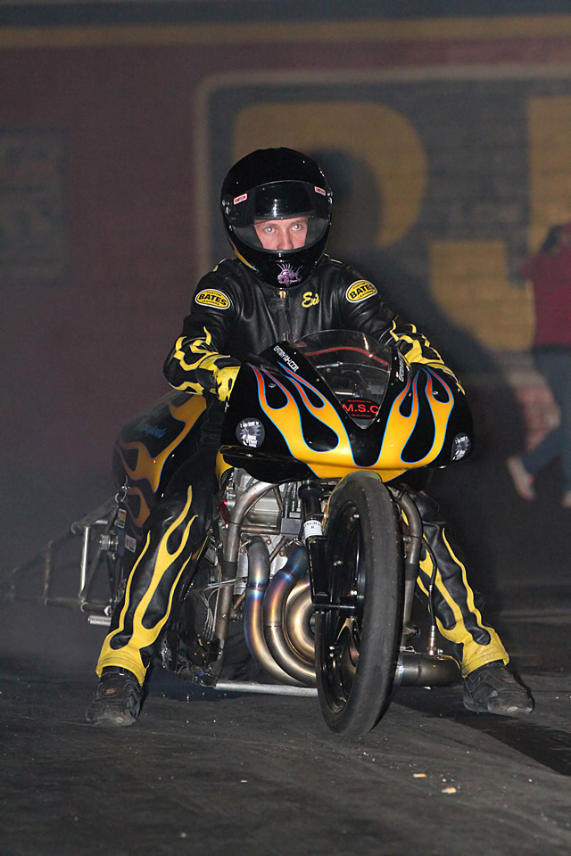 Sadly for Fisher, he was pulled off the starting line for the final by the PDRA’s Traction Twins when his beautiful yellow bike sprung an oil leak out of the water box. And McKinney was beatable with a 4.12, stretching out second gear with a startling new tune-up from Owens. “The shift points were different,” said McKinney. “It was like a Sunday drive at first, then turned into ‘Game On.’ It hit the rev-limiter going into third gear, and I’ve never done that. It probably maybe would’ve been an .06 or .07, but it caught me off-guard. Ashley’s got a new idea going on and it’s gonna be a pretty good deal for us….if I could just learn how to ride it!”