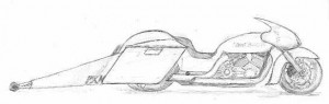 On May 9th, 2010, Star Racing’s George Bryce drew the sketch below of a new concept in motorcycle drag racing – the “Drag Bagger,” to compete in the ADRL Pro Extreme Motorcycle (PXM) class.