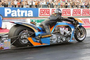 Points leader Ian King qualified second behind Sverre Dahl’s 6.573 secs. @ 206 mph with a 6.626 @ 212 mph pass that had the Gulf Oil/Grand Prix Originals backed rider rolling off and on the throttle in order to overcome a seriously tricky track surface