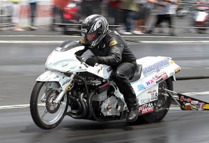 Jevarra “Birdman” Martin was nearly the story of the event. His old school Kawasaki dragbike slipped out from under him as he came out of the waterbox. The Birdman calmly got up, picked up his motorcycle, won the round, and went all the way to the 5.60 semis.