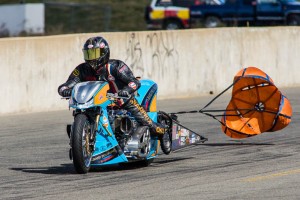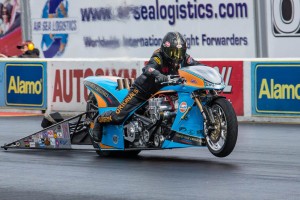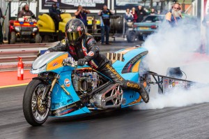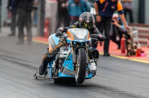 Eliminations round one saw King’s early shutoff 6.2552 @ 181.34mph just defeat Dutch rider Rene van den Berg (also Puma Yamaha) who made a fine first six second pass of 6.5473s @ 216.16mph. King’s closest rival for the European Championship title Rikard Gustafsson of Sweden ran a stout 6.5936s @ 207.92mph on his Pro 1 Puma Suzuki Funnybike to defeat Czech rider Otto Knebl on the more powerful Puma Yamaha.
