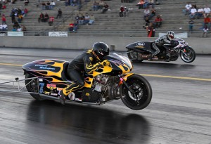 In the eighth mile Pro Comp class, Ryan Schnitz led Q1 with a 4.09 sporting brand new Lectron EFI throttle bodies on his HTP Performance Hayabusa. HTP only received the new throttle bodies and fuel rail on Thursday before the race. “We have a couple of new generations of these coming out in 2013,” promised Gilham.