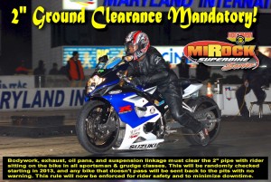 The 2″ Ground Clearance Rule will be enforced at MIROCK in 2013 in all sportsman and grudge classes. This has always been a rule but will now be randomly enforced for rider safety and to minimize downtime due to oil downs from busted oil pans and parts and debris from coming off the bottom of the motorcycle. If your bike is too low you will be sent back to the pits with no warning. Random checks may be done in tech, staging lanes, or the starting line to make sure riders are not changing the bike’s height after it has already been checked. If your bike is too low, raise it up and have a safe race.