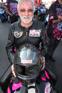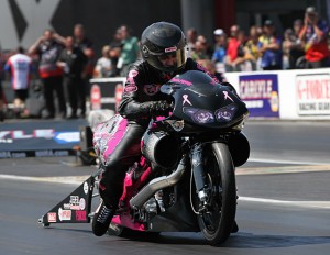 NHRA Mello Yello Pro Stock Motorcycle racer Junior Pippin’s return to racing after two years away was a mixed bag. Although Pippin didn’t qualify for the NHRA Carolina Nationals at zMax Dragway, his effort to raise money for breast cancer research resulted in a lot of pink PiranaZ T-shirt sales—the main goal of Pippin’s efforts these days (You can order the new PiranaZ shirts and help support breast cancer research here: http://www.piranaz.net/store/mens/pippin-charity/). “It’s not exactly what we had in mind,” said Pippin. “Making the field would have certainly been better. But all in all, we’re alright.”