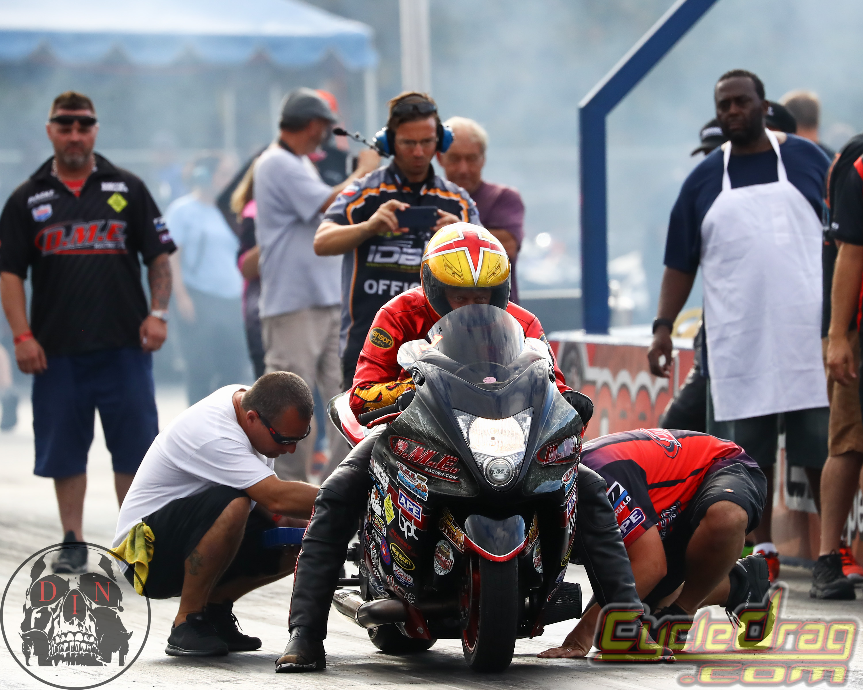 Overcast conditions helped produce record-setting runs at the International Drag Bike League (IBDL) DME Fall Nationals held at Maryland International Raceway last weekend. However, those conditions also produced rain late Sunday, meaning eliminations in four divisions – the Orient Express $10,000-to win Pro Street Battle Royale, DME Racing Real Street, Vance & Hines 4.60 and APE Top Sportsman – will be completed at the IDBL World Finals on Nov. 3-5 in Rockingham, N.C.
