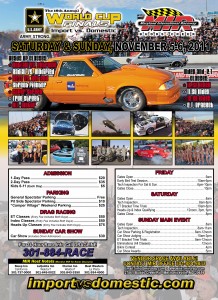 The 16th Annual U.S. famous Import vs. Domestic battle for the World Championship will take place at Maryland International Raceway on Saturday & Sunday, November 5-6, 2011. The World Cup Finals features a custom car show, bikini contest, a huge vendor midway, DJs, live bands, and of course import vs. domestic drag racing! With over 10,000 people in attendance every year the WCF has become a event phenomenon on the east coast!