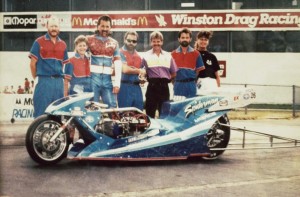 The motocross was fine, I continued to play with dirt bikes on and on even after drag racin’. I was just into the motors and building the engines, making things as fast as they possibly can from point A to point B. Some people just get interested in, and in love with circle track racing. I love all racing personally, but the one that set my tone, the one that I wanted to ride, was drag racing. I’m glad I did now, ’cause I’m going on 34 years of drag racing. You sure can’t race dirt bikes for 34 years! I’ve had a lot of fun. Met a lot of good people.